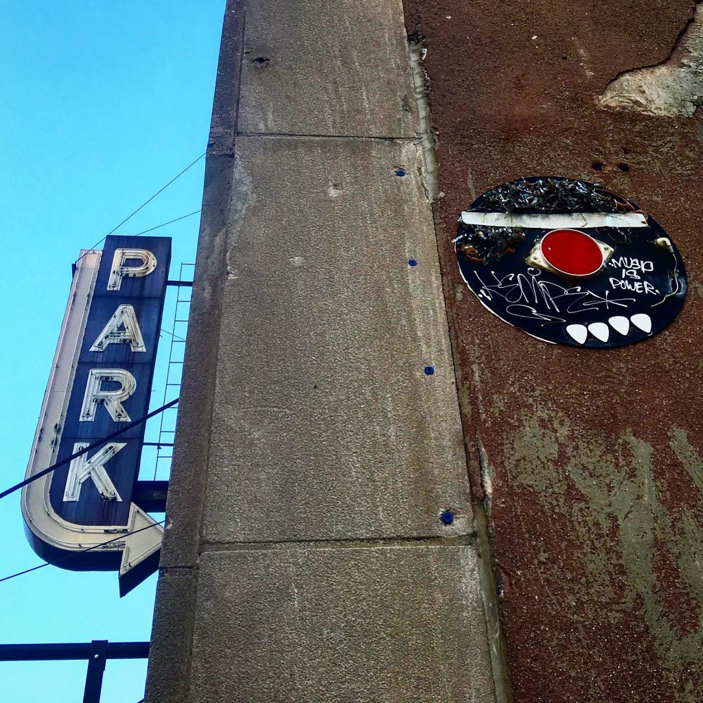 This Recordface has seen better days but was still hanging out earlier this year on the side of a parking garage at Market and Talbott streets, just east of Monument Circle. It sits just under a sign advertising Enterprise Rent-A-Car.