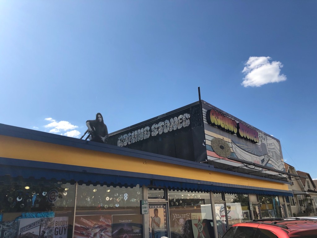 A colorful facade complete with cutouts of rockers such as Ozzy Osbourne and KISS help Rolling Stones Records standout along a bustling portion of Irving Park Road.