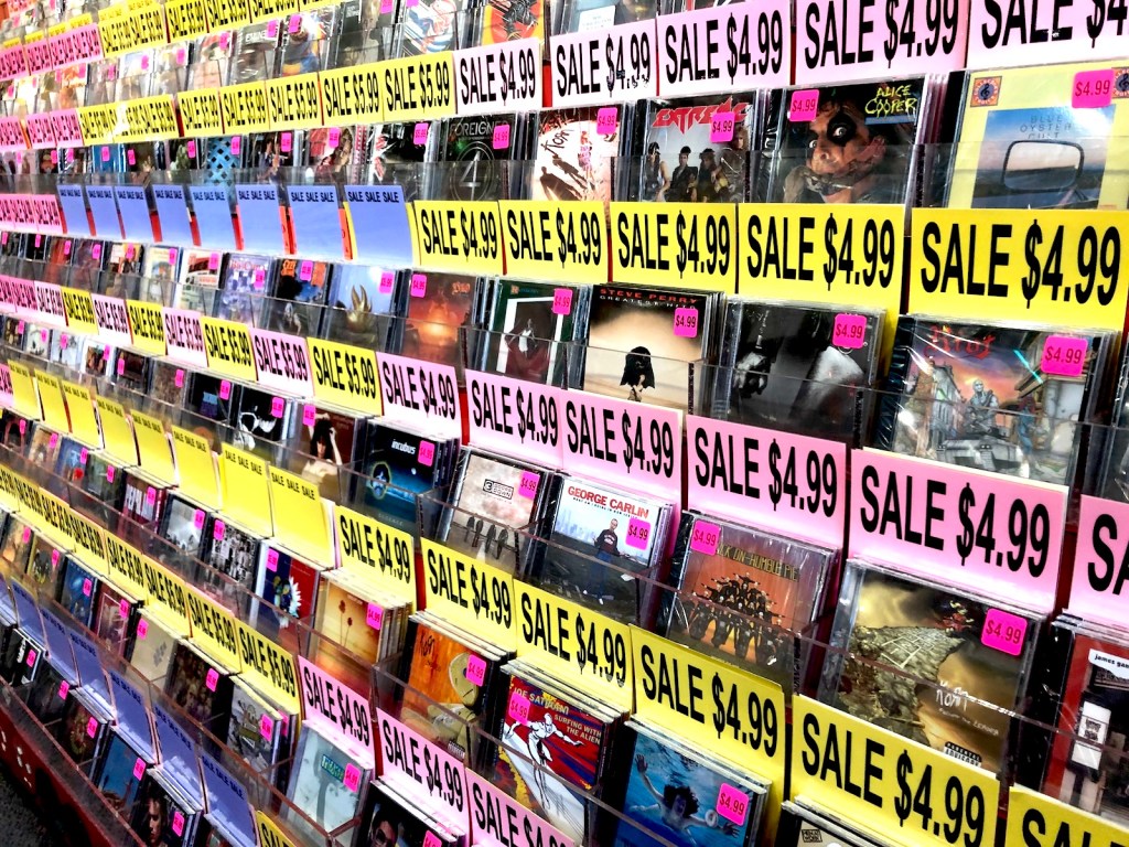 The inside of Rolling Stones Records is like walking back into a late 80s, early 90s record store. Flashy signs. Racks and racks of CDs. Modest sections of movies and vinyl. There’s even a listening station in the center of the store.