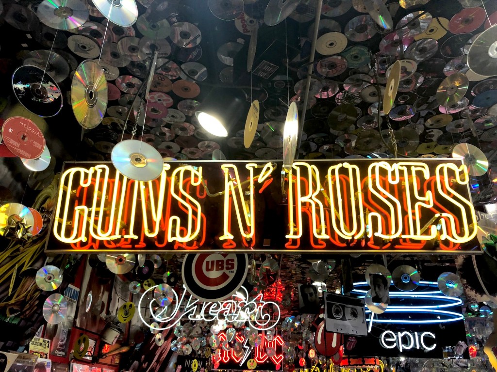 The band is one of many represented among the bright neon signs throughout the store. Thousands of CDs also shimmer as they hang from the ceiling, leaving now doubt what form of music plays a major role here.