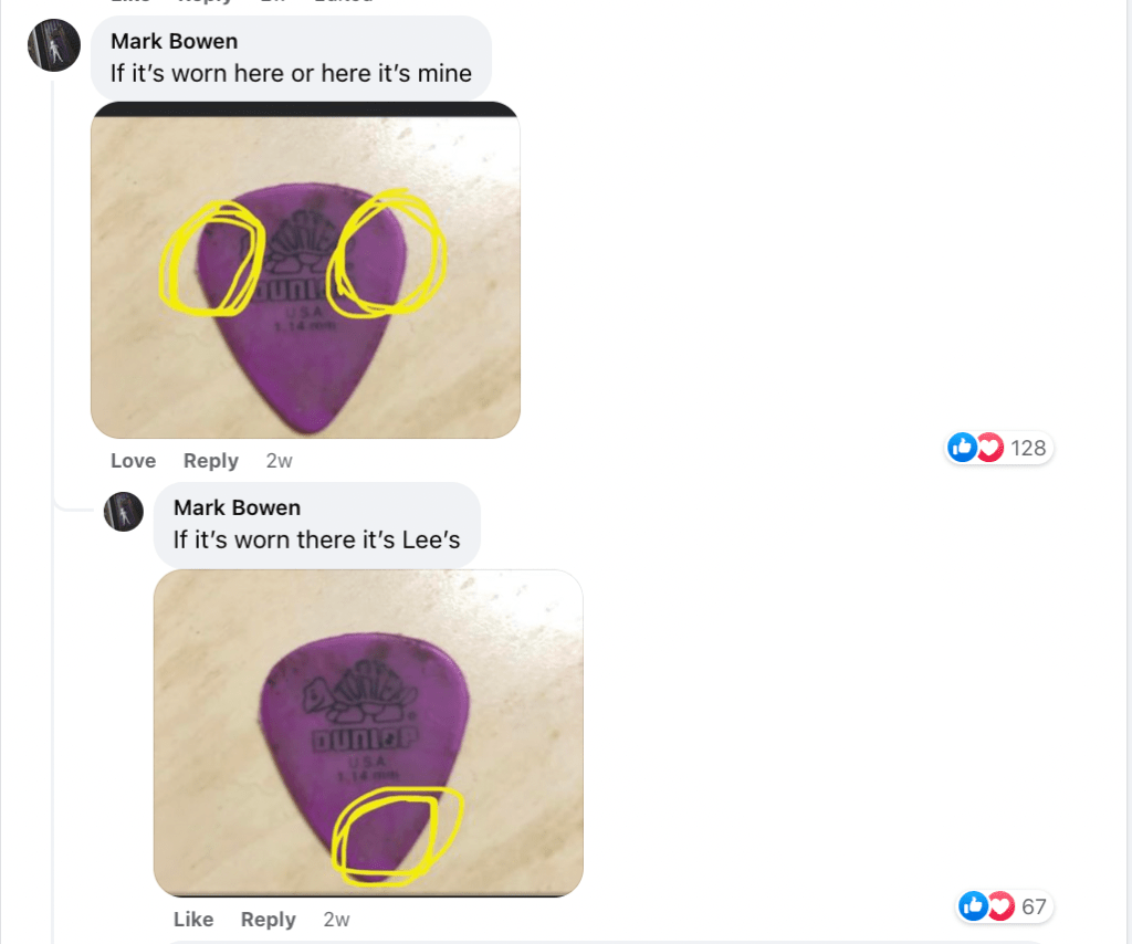 Then, I received notification of an interesting new comment on the photo I posted in the Facebook group. Bowen himself had been following the conversation and decided to provide insider knowledge on how to tell who used the guitar pick during the show.
